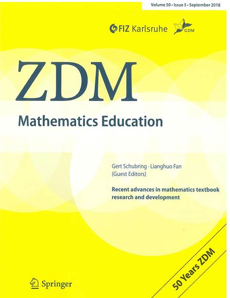 ZDM第50卷第5期的主题是“数学教材研究和发展的最新进展“,共刊载了15篇论文。亚洲数学教育中心主任范良火教授与德国Bielefeld大学的Schubring教授是该期的特邀主编,他们合作的调查论文(Survey Paper)梳理了该领域研究的有关历史和最新进展。另外,范教授、熊斌教授、赵冬臣副教授(哈尔滨师范大学)和牛伟强博士生合作发表的研究论文《How is cultural influence manifested in the formation of mathematics textbooks? A comparative case study of resource book series between Shanghai and England》(《文化影响是如何体现在数学教材的形成过程中的——上海与英国系列教材比较案例研究》),从文化视角探讨了数学教材的开发问题,通过中国和英国版的数学《一课一练》这一特殊案例,在国际上首次实证性地研究了文化对数学教材形成的实际影响。王建磐教授和鲁小莉博士后发表的研究论文 《Selection of content in high school mathematics textbooks: an international comparison》(《高中数学教材内容的选择:不同国家数学教材的比较》),从代数、几何、统计与概率、微积分4个核心领域,比较了中国、法国、德国、日本、俄罗斯、英国和美国高中教材的选读内容及其呈现方式并讨论了该分析结果对中国高中数学课程改革,特别是对改革过程中教科书发展的影响。
