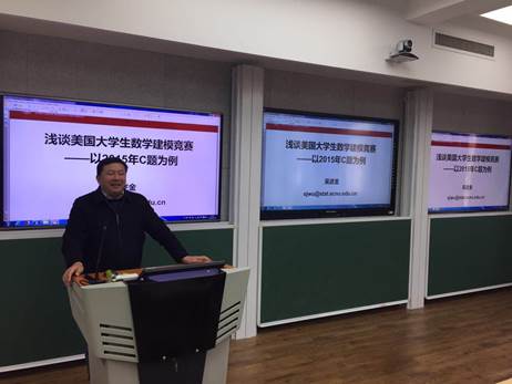 吴述金副教授以《浅谈美国大学生数学建模竞赛——以2015年C题为例》为题,深入浅出的向同学们讲解了美模竞赛的题技巧和方法,摘要书写的重要性和规范性,论文格式要求,以及如何将数学语言转换为题目对应的专业语言。