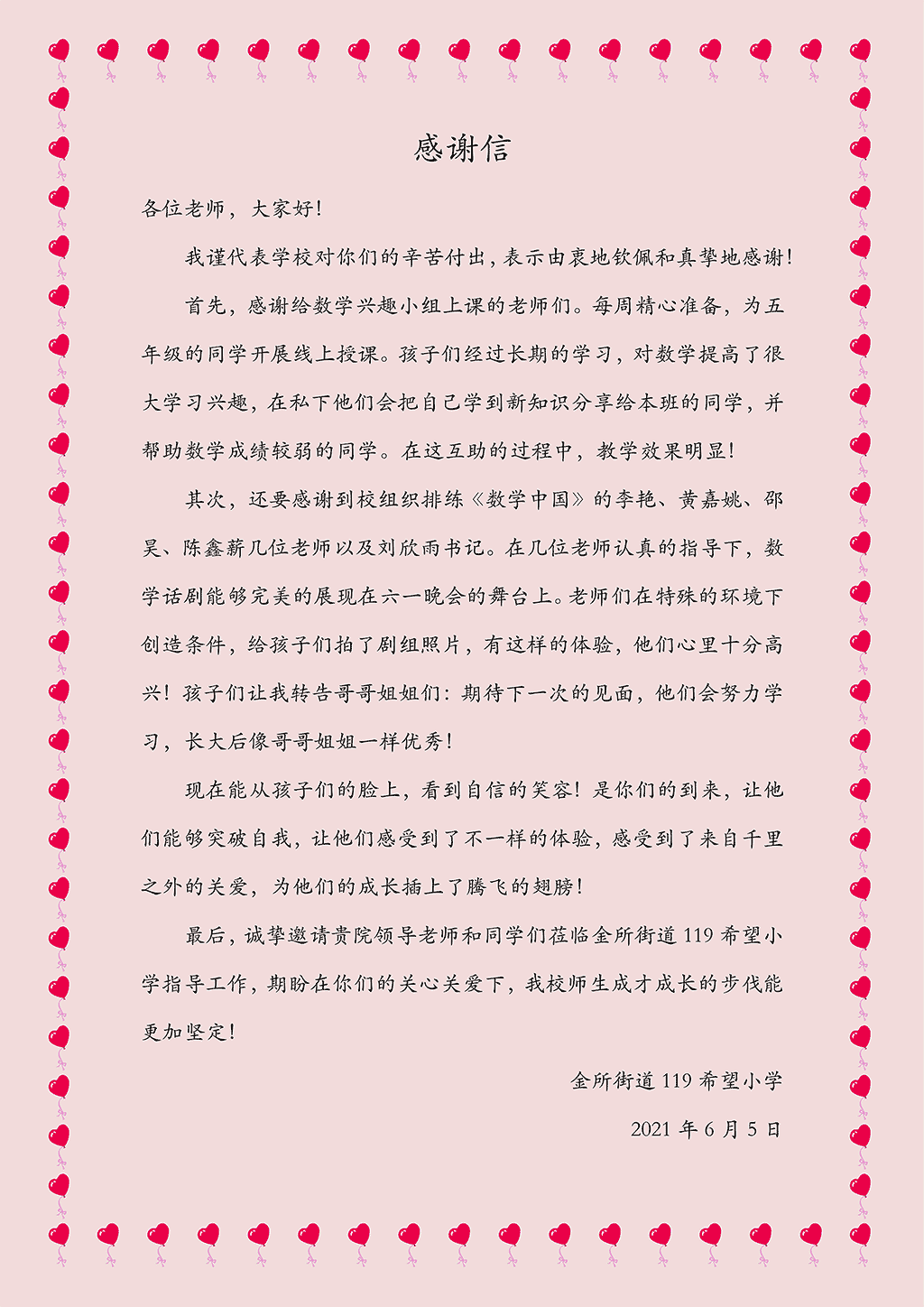 附:云南省寻甸县金所119希望小学向我院发来感谢信