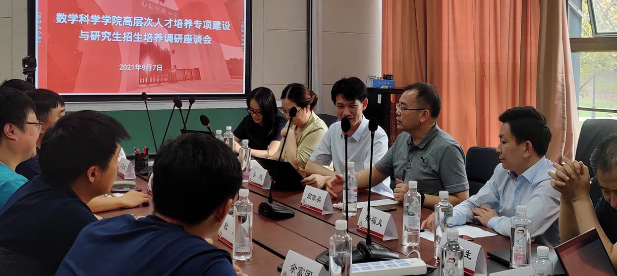 周傲英认真听取了我院在研究生招生和培养工作上的汇报,对相关工作给予了肯定,对我院在未来研究生招生、跨学科培养、师资队伍建设、专业学位设置等方面提出意见和建议。周傲英表示,数学学科必须围绕国家战略需求,加强关键领域急需的高层次人才培养专项建设,强化学科交叉融合发展,不断提升研究生招生培养治理。研究生院常务副院长吴健也就深化科研经费博士制度、提升研究生生源质量等给出了建议。
