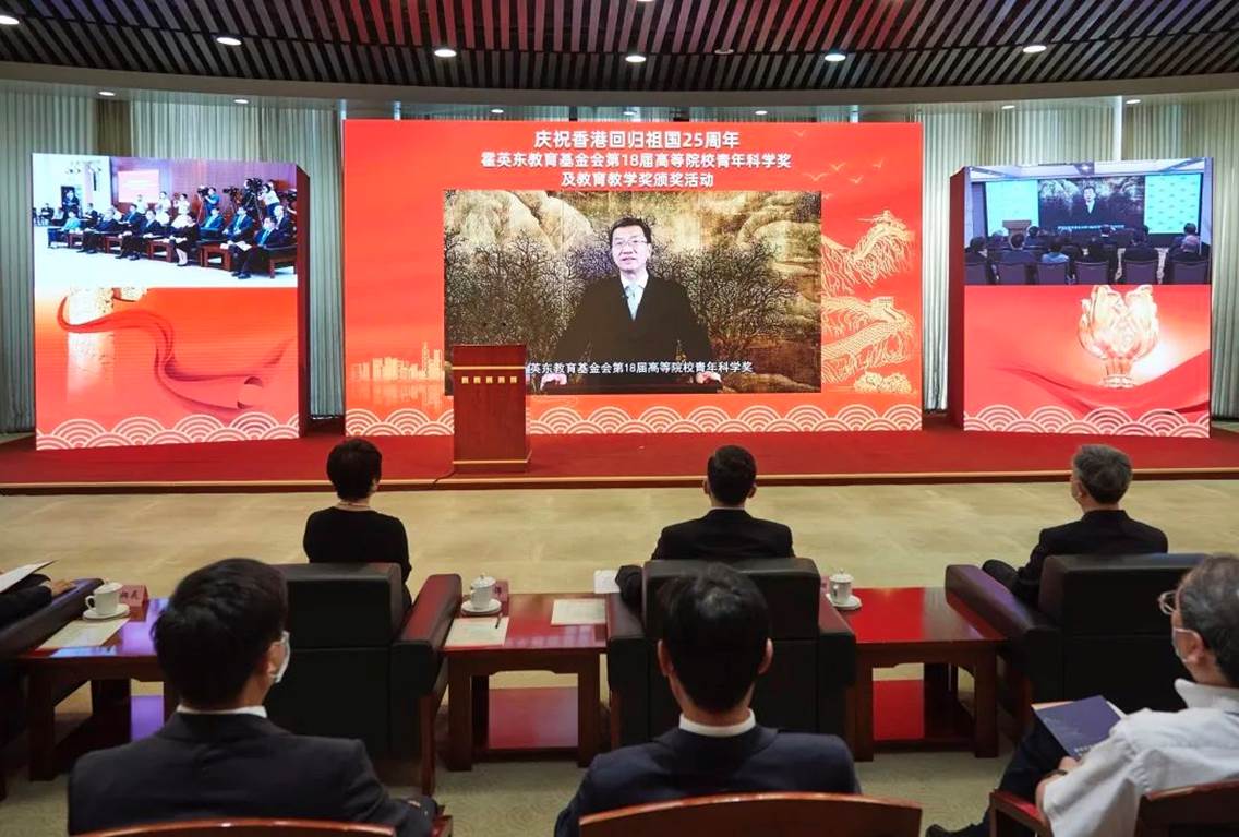 7月21日,“庆祝香港回归祖国25周年”霍英东教育基金会第18届高等院校青年科学奖及教育教学奖颁奖活动在北京和香港连线举行。教育部部长怀进鹏和香港特别行政区行政长官李家超讲话。