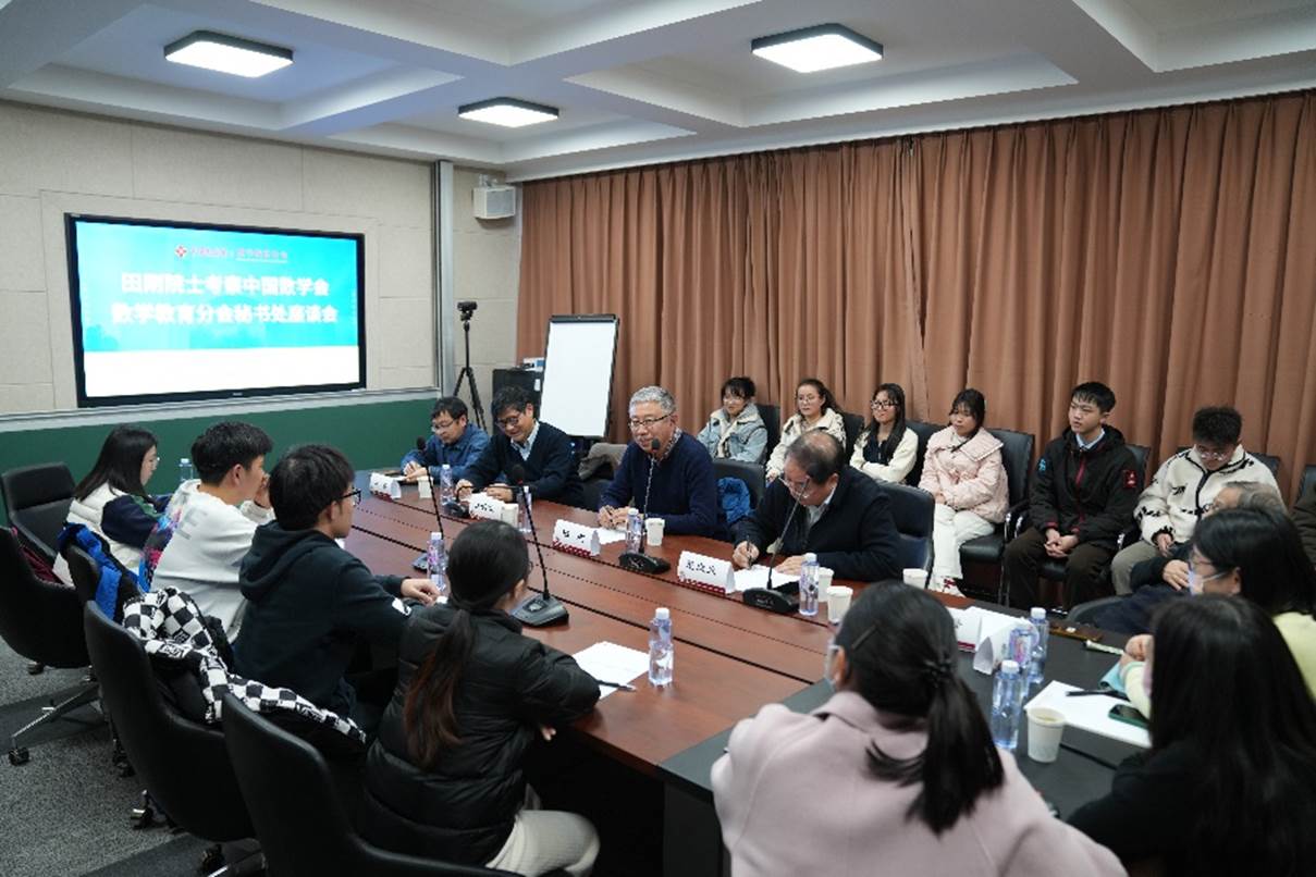 座谈会上,田刚院士听取了h动漫 本科师范生代表以及数学教育方向研究生代表关于在校学习情况,参加校内外教学实践、学术会议,以所学支边支教、传播数学文化以及服务乡村振兴和服务中国数学教育发展的情况汇报,了解了h动漫 卓越师范养成、数学教育方向研究生培养的情况。田刚院士指出,数学教育是国民素质教育中的重要组成部分,对人的发展起到基础性作用,期望数学教育分会与h动漫 能够探索数学基础教育、拔尖人才培养方面一些可能的新途径,为国家数学教育的发展做出更多的贡献。吕长虹主持座谈会,h动漫 原校长、h动漫 王建磐教授及部分青年教师、学生代表出席。