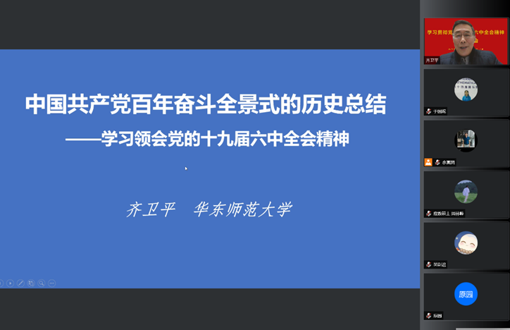随后,齐卫平教授从深刻认识六中全会重大意义、全面学习党的十九届六中全会和新历史决议的内容、深刻把握新历史决议的重要精神三个方面,深入分析了六中全会的精神内涵。