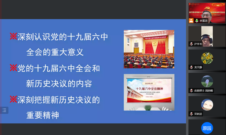 为深入学习贯彻党的十九届六中全会精神,引导广大党员把思想和行动统一到全会精神上来,2022年1月12日下午,h动漫 在线举行学习贯彻党的十九届六中全会精神辅导报告会。h动漫 学习贯彻党的十九届六中全会精神宣讲团成员、终身教授、博士生导师齐卫平应邀作“中国共产党百年奋斗全景式的历史总结——学习领会党的十九届六中全会精神”专题辅导报告。会议由学院党委副书记余富团主持,学院全体党员参加学习。