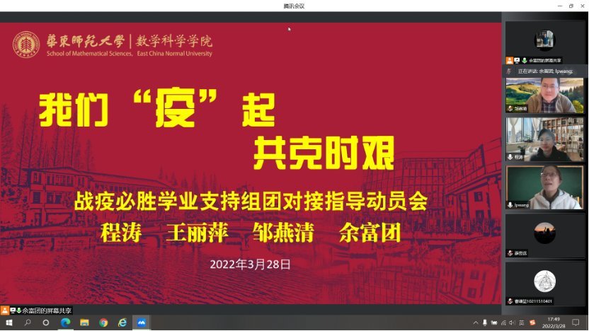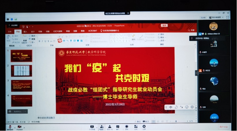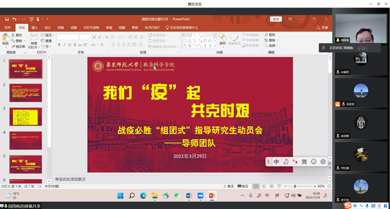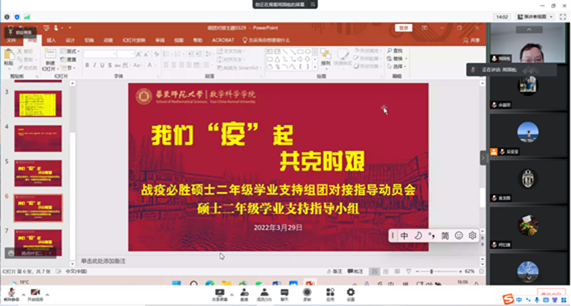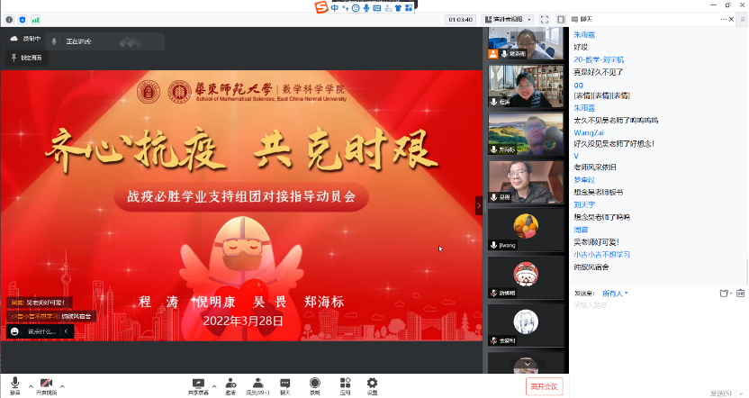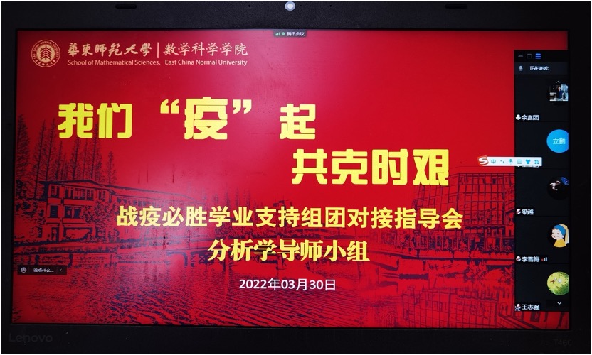 守土有责、守土负责,随后,研究生、本科生分条线分别召开了“学业支持组团对接指导动员会”、“博士毕业生导师指导研究生就业动员会”、“导师团队指导研究生动员会”、“硕士二年级学业支持指导小组动员会”、“硕士一年级学业支持组团对接指导动员会”,再发动再动员。党员带头、全员参与,老师们纷纷启动指导活动,“博士生毕业论文与就业要双管齐下、两不误”,“闷在宿舍不舒服,要多跟导师联系,发泄出来会好很多”,“研究卡壳的时候,随时跟导师沟通”,“数学分析的教学辅助资料、相关教学资源都上传到超星泛雅平台上了,如果没搞清楚怎么用,我下次再给大家讲一讲”……老师们纷纷给学生支招。截止目前,全院已开展线上组团对接指导活动7场,本周将完成近20场活动。学院党委将持续推进活动开展,加强考核,直至战疫取得胜利。