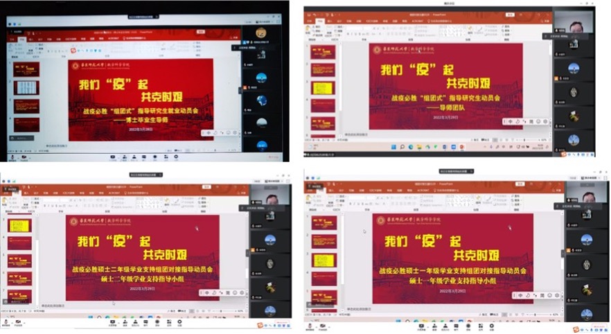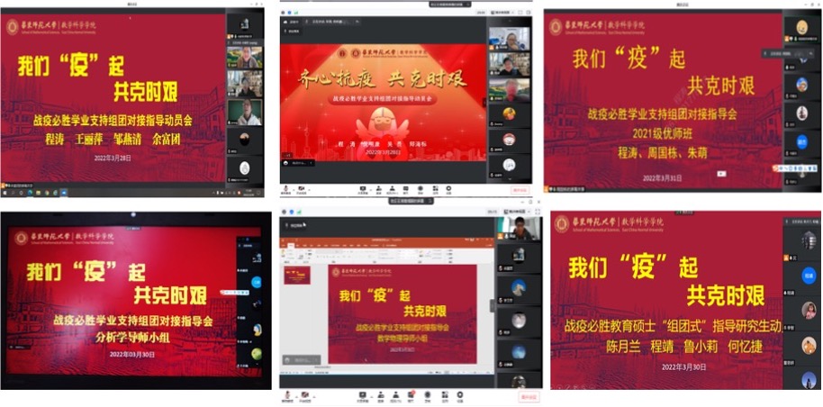 守土有责、守土负责,随后,研究生、本科生分条线分别召开了“学业支持组团对接指导动员会”、“博士毕业生导师指导研究生就业动员会”、“导师团队指导研究生动员会”、“硕士二年级学业支持指导小组动员会”、“硕士一年级学业支持组团对接指导动员会”,再发动再动员。党员带头、全员参与,老师们纷纷启动指导活动,“博士生毕业论文与就业要双管齐下、两不误”,“闷在宿舍不舒服,要多跟导师联系,发泄出来会好很多”,“研究卡壳的时候,随时跟导师沟通”,“数学分析的教学辅助资料、相关教学资源都上传到超星泛雅平台上了,如果没搞清楚怎么用,我下次再给大家讲一讲”……老师们纷纷给学生支招。截止目前,全院已开展线上组团对接指导活动10余场,本周将完成近20场活动。学院党委将持续推进活动开展,加强考核,直至战疫取得胜利。