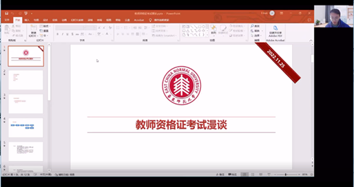 李昆以《教师资格证考试漫谈》为题,就综合素质、教育知识与能力、思想政治学科知识等方面进行了经验分享,使同学们对考试内容和答题形式有了清晰的了解。他还为同学们例举了教案模板的格式和具体要求。