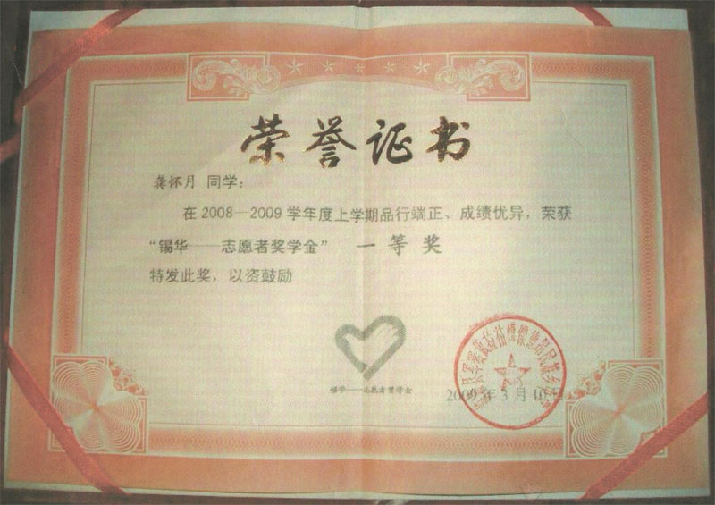 外孙女曹晓群继承外公遗志,大学毕业后志愿去云南边疆支教一年, 并用自己得到的报酬在当地设立“锡华—志愿者奖学金”奖励优秀学生。这是奖学金的证书。