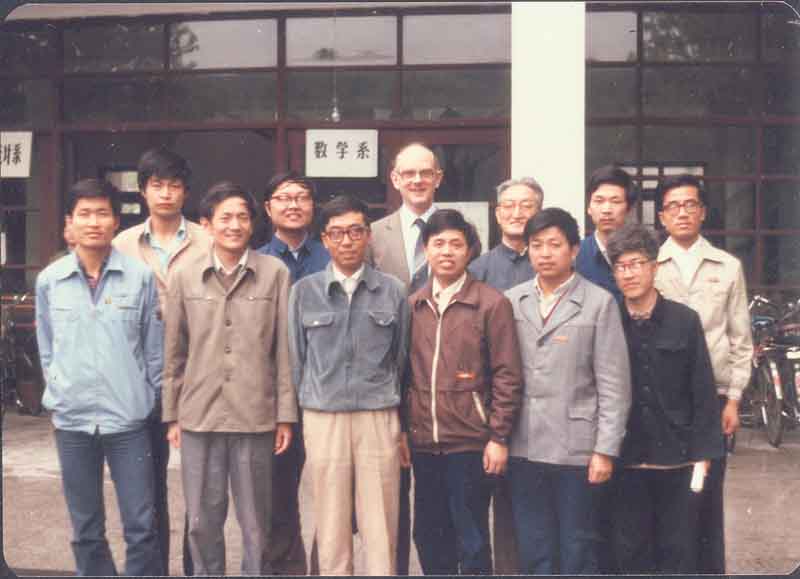 1985年Carter教授讲学时留影,前排左起是温克辛、邱森、叶家琛、王建磐、杜杰、曹佑安(湘潭大学), 后排左起是朱天葆、时俭益、Carter、曹锡华、席南华、林磊