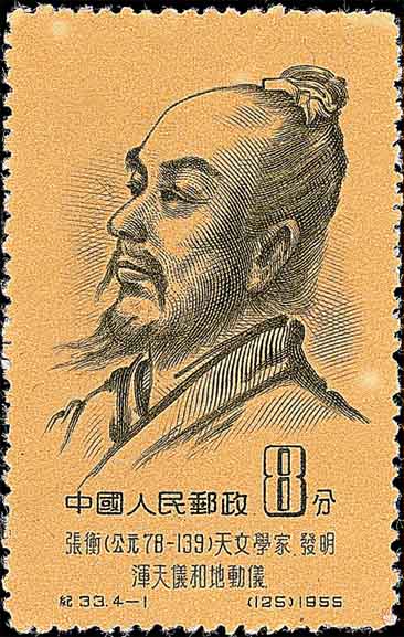 图3是东汉科学家张衡(78-139), 他在天文测量中得出圆周率π的两个近似值3.1466和3.1623, 这比印度和阿拉伯人早了500年. 图4是魏晋时期数学家刘徽(公元3世纪, 山东人, 图5是山东邮政刻制的首日纪念邮戳). 他在《九章算术·圆田术》注中, 用割圆术得出圆面积与周长的关系式和圆周率的计算方法(参见图6中上部和图7, 它们分别是中国邮资明信片和密克罗尼西亚邮票). 由此得到π=3927/1250=3.1416, 通称它为“徽率”. 请注意刘徽在割圆术中提出的“割之弥细, 所失弥少, 割之又割以至于不可割, 则与圆合体而无所失矣”, 这种计算思想就是当今的极限概念. 图8是南北朝时期数学家祖冲之(429-500, 中国小型张), 他则更计算出圆周率π在3.1415926和3.1415927之间, 并给出π的两个分数近似值: 约率22/7和密率355/113. 这些都比欧洲人早了一千年.