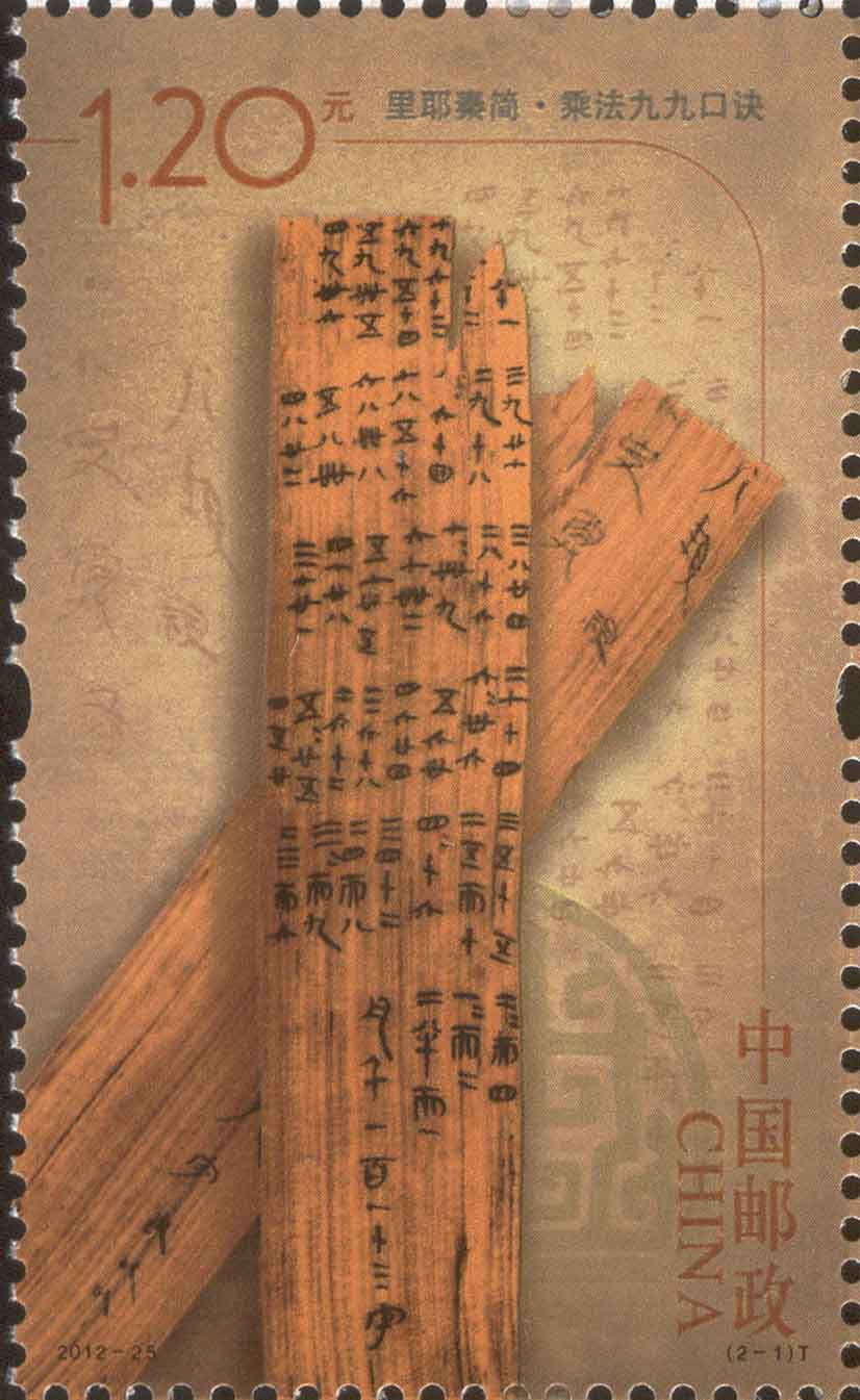 2012年9月13日中国邮政发行一套票名为《里耶秦简》的特种邮票。这套邮票有两枚,分别是“乘法九九口诀”(图1)和“秦历日”(图2)。 这是2002年6月在湖南湘西龙山县里耶镇里耶古城出土的秦简。这批秦代简牍,从秦王政二十五年至秦二世元年(前222-前208),共有3万7千多枚。 简牍内容涉及秦代政治、军事、赋税、财政、文化、职官、算术、历法等等各个方面。中国邮政当局选择其中两枚通过邮票的形式向大家展示。这两枚邮票应该说都是与数学有关, 尤其是第一枚“乘法九九口诀”,是目前世界上最早、最完整的乘法口诀表实物。