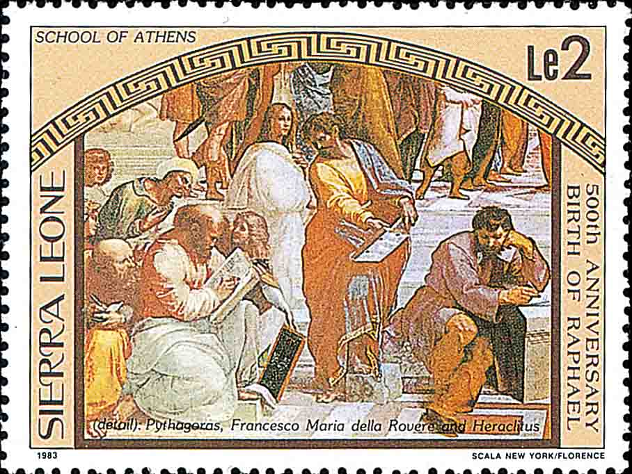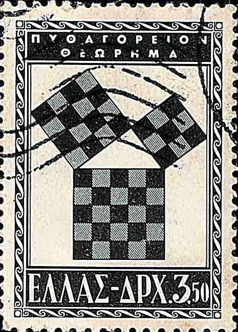 这个定理从最简单 32+42=52 开始到一般性阐述 a2+b2=c2 已经有四千多年历史了, 几乎所有的文明古国 (中国、希腊、埃及、印度等等) 都有关于它的记载. 在西方, 说是古希腊哲学家、数学家毕达哥拉斯 (Pythagoras, 约公元前 580 年 -- 公元前 500 年) 在大约公元前 550 年发现的 (图 3 和图 4 是 1955 年希腊发行的纪念毕达哥拉斯邮票, 图 5 是 1983 年萨拉里昂发行的邮票, 该画取自梵蒂冈壁画, 表现毕达哥拉斯在讲学).