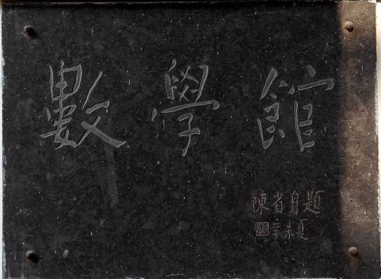 7. 现在数学馆门口已经换了牌子。门口西墻上的建筑铭牌(它记录本大楼奠基和落成时间,设计和承建单位以及有关设计数据)没有了,但东墻上陈省身先生书写的“数学馆”铭牌还在。